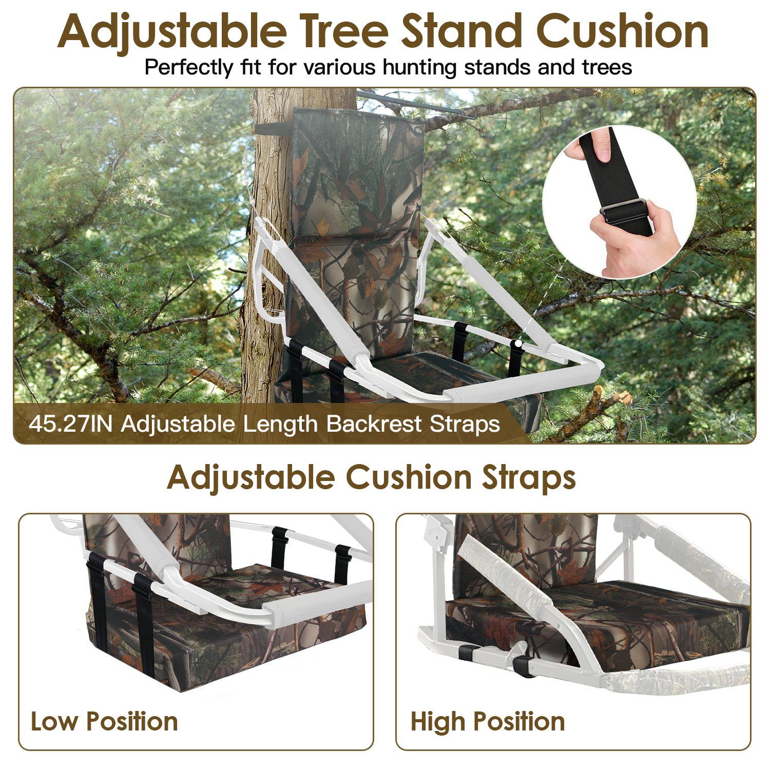 *Adjustable Height & Circumstance*:Come with adjustable straps on the back of backrest in the total length of 45.27in,you can adjust the straps to fit for various diameters of trees. Additionally,17.71in seat straps allow you to flexibly adjust the height of seat,helping you to keep the optimal hunting posture.