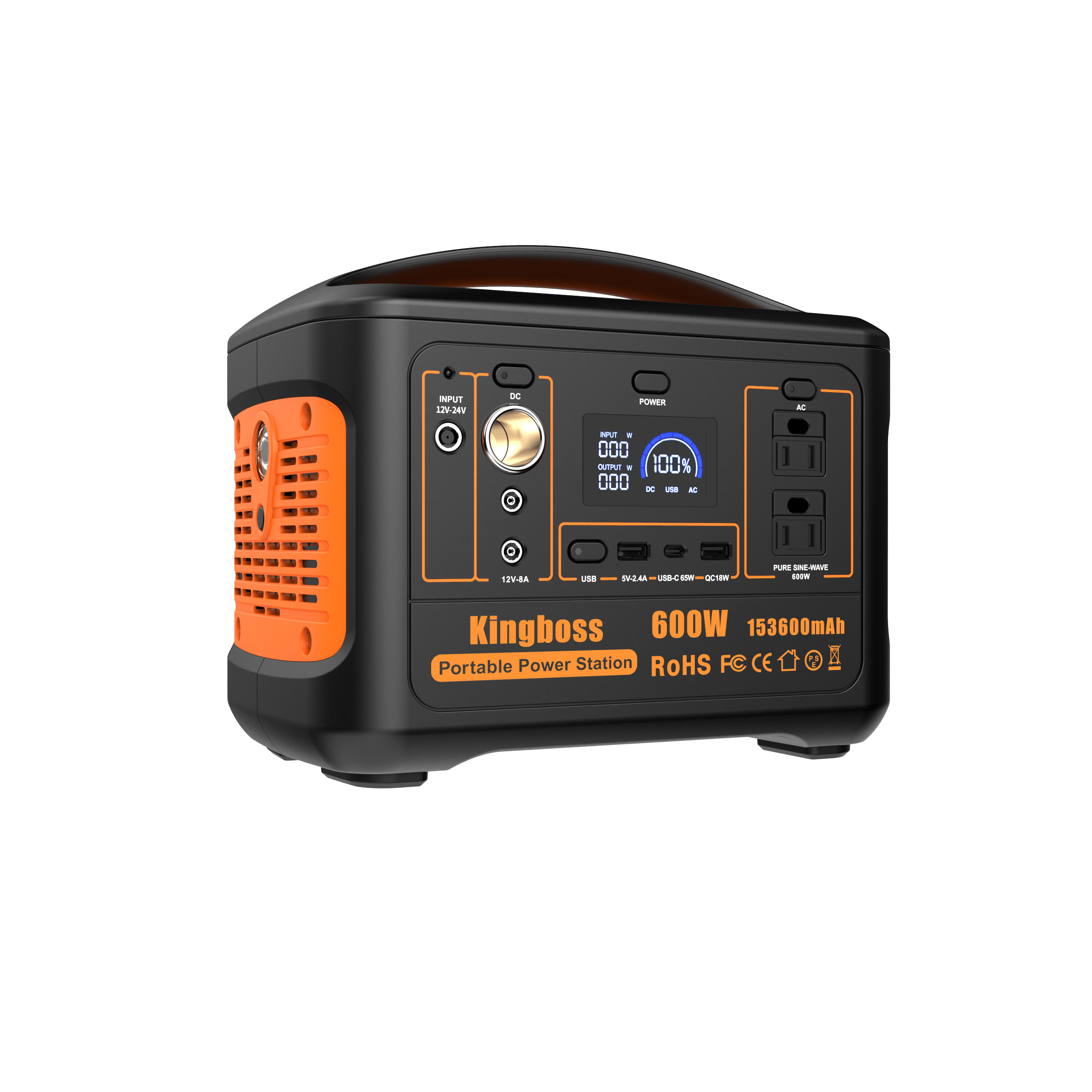 [MULTIPLE OUTPUT PORTS]: Kingboss Portable Power Station is featured with AC/DC/USB outputs: 2*110V AC output (600W); QC 3.0 USB port; 1*USB port (5V-2.4A); 1*USB-C PD65W; 1*DC input with 1*DC input (12V- 24V).[DEVICES]: Our Portable Power Station can charge devices such as: Computer; Jump Starter; Mini Projector; Fan; Mini Fridge; Printer; Drone; Phones/Tablet; Powertool; Laptop/TV. Only Devices up to 600W can be charged.[INCLUDES]: Kingboss Electric Generator includes 600W outdoor and indoor power supply; Car charger; AC power adapter; USB-C Cable + Kingboss Travel Carrying Case. Our 600W Power Station is perfect to be transported due to its weight (11Ibs) and size (7.70x5.20x9.10in).[RECHARGING METHODS]: Our Battery Powered Outlet can be recharged: With a compatible 100W solar photovoltaic panel (8 hours); With our car charger (12 hours); With AC Wall Outlet (6.5 hours). Lithium Battery 1000W recharges faster than other batteries.[PROTECTION]: Kingboss Battery Generator is equipped with an advanced BMS (Battery Management System) Multiple Outlet that protects the battery and devices against short circuits; over-temperature; overcharging; overvoltage and overpowering.[SAFETY]: Our power bank includes a Pure Sine Wave AC output that ensures stable and safer charging; and reduces audible and electrical noise. On top of that; it contains an MPPT controller built-in for optimized high-efficiency solar charging.[RELIABLE]: To give customers a pleasant experience; Kingboss offers a 2 Year Warranty that allows you to return the portable generator by 7 days in case it is defective; and a 24/7 customer service. Camping outdoor awaits you with our Solar Generator!