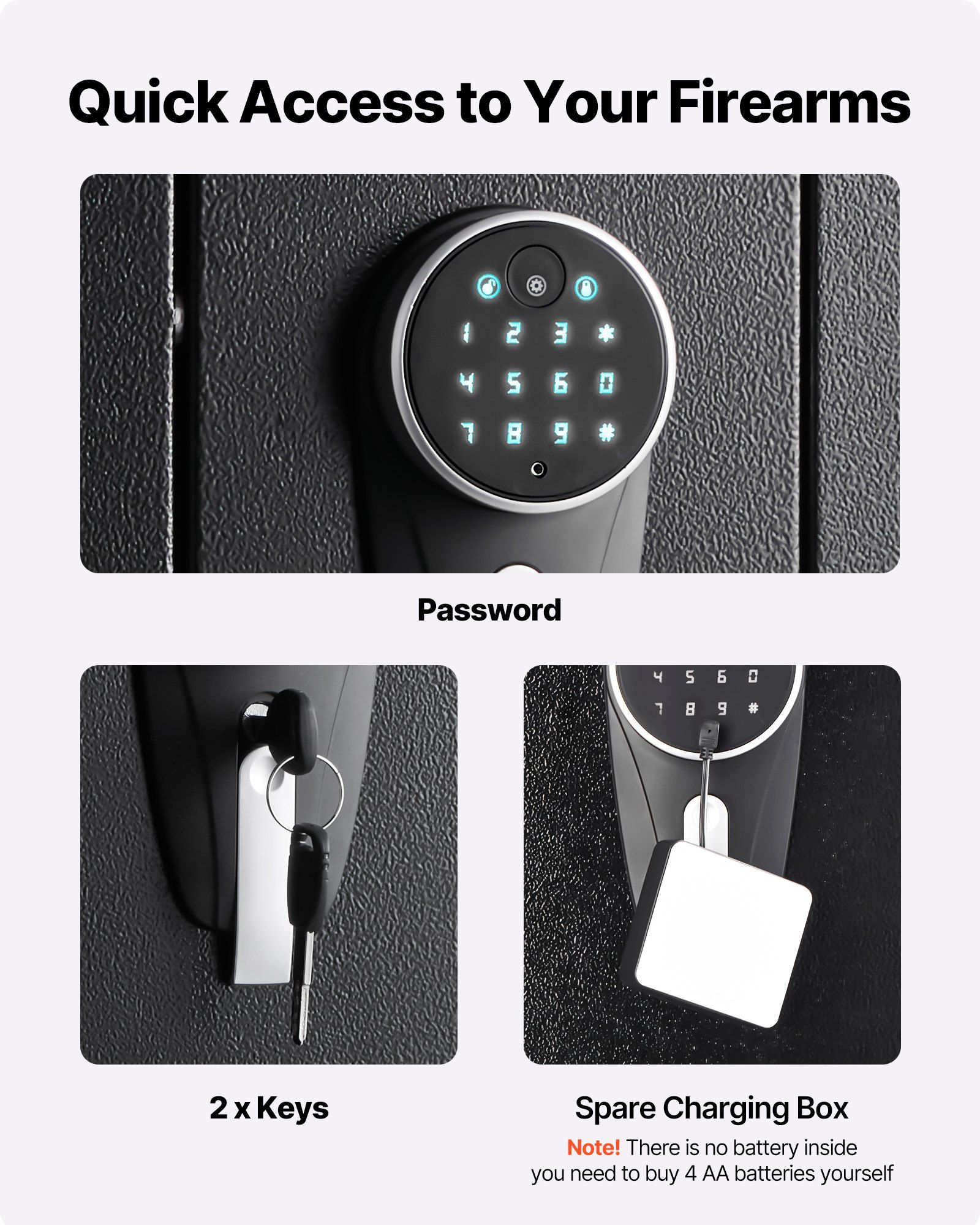 2.Smart Lock: 9-digit touchscreen PIN lock with fast access. PIN length user-settable from 3-8 digits; auto-lock secures the safe on close. Includes an emergency key and an external charging port so you can unlock the gun cabinet even if the battery is dead