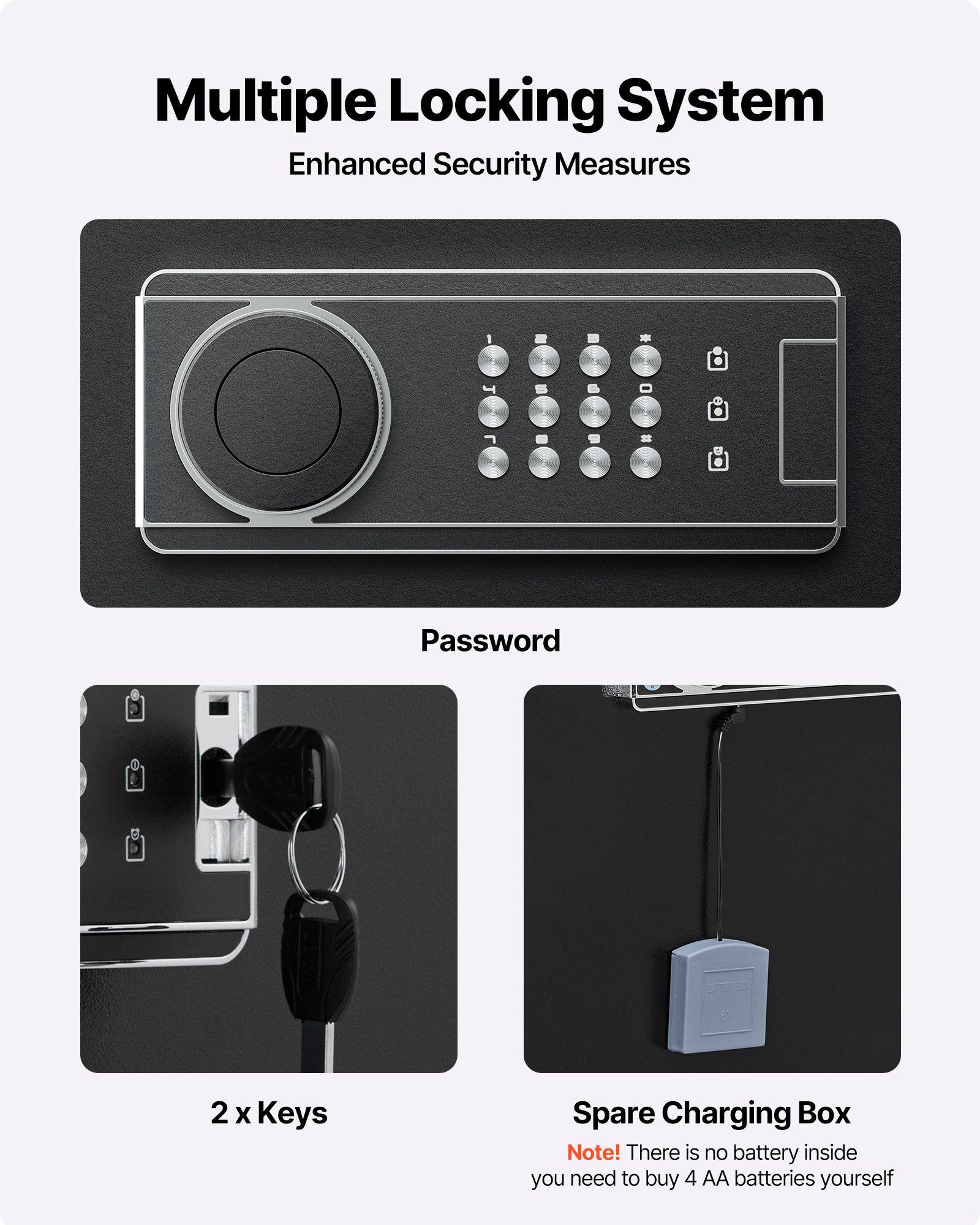 2.Smart Lock: The 9-digit touchscreen password lock provides quick access. The password can be set between 3-12 digits, with an auto-lock function for added security. It also includes an emergency key and spare charging box for easy unlocking during battery depletion.
